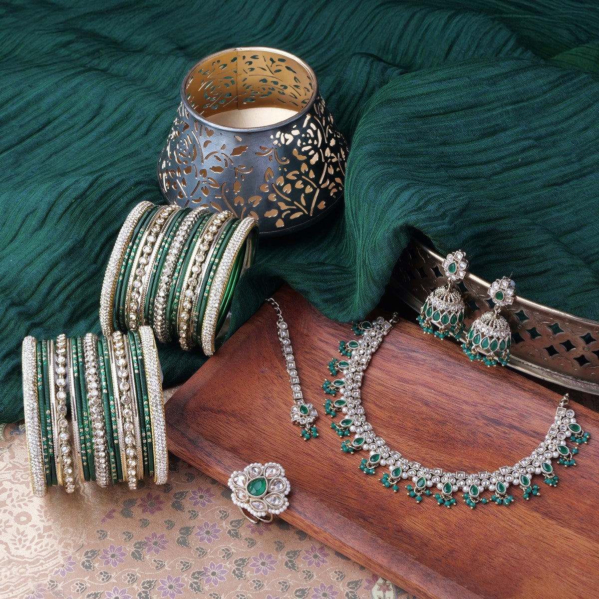 Nazeera Kundan and Minakari Choker Set in Green and Pearl